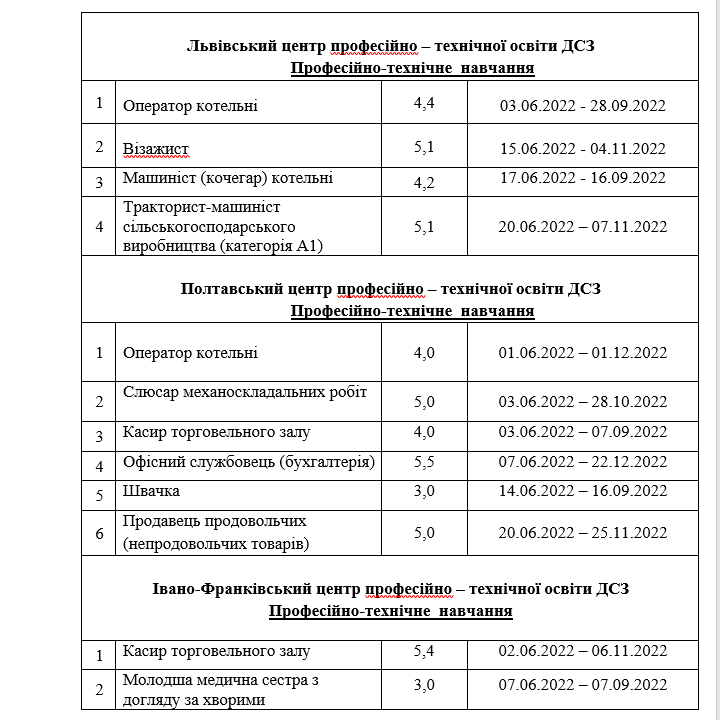 Графік професійного навчання у центрах професійно-технічної освіти Державної служби зайнятості